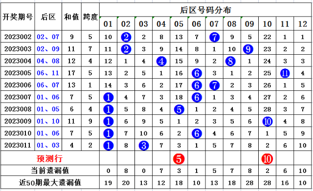 后区冷热分析(最近5期未开出的号码为冷号):上期大乐透后区开出号码01 03,近十期开出冷冷形态1次,冷热形态2次,热冷形态3次,热热形态4次,本期推荐5码:03 05 10 11 12,参考号码05 10。