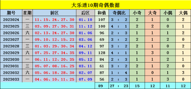 最近10期后区出现的奇偶比为12:8,大小比为11:9。