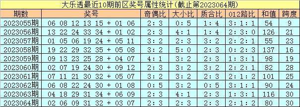 开奖回顾:体彩大乐透第23064期开出奖号为:02 06 09 31 32+03 07,前区012路比为2:1:2,质合比为2:3,奇偶比为2:3,大小比为2:3,后区012路比为1:1:0,质合比为2:0,奇偶比为2:0,大小比为1:1。