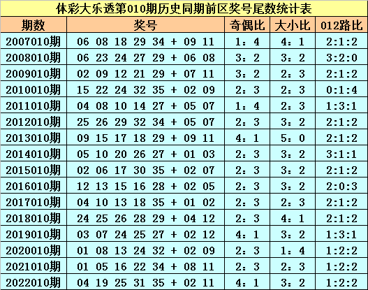 前区尾数频次统计:在第010期历史同期开奖中,前区尾数5开出次数最多,为13次,尾数4出现12次,尾数2、9出现9次,尾数6、8出现8次,尾数7出现7次,尾数0、3出现5次,尾数1出现4次,本期前区奖号必杀一尾:5。