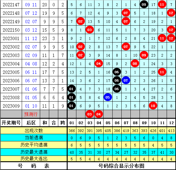 前区012路尾数分析:在第010期历史同期奖号中,前区奖号尾数012路个数比为27:23:30,1路尾数奖号走势最冷,其中各路尾数奖号都出现了1次轮空现象,本期预计0路尾数奖号走热,看好奖号012路尾数比为3:1:1。