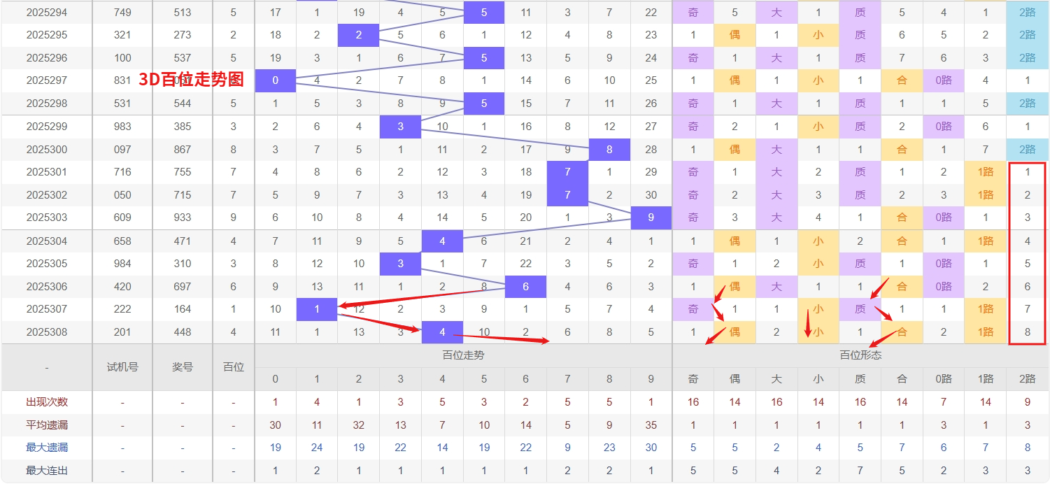 福彩3D百位分析:第2025308期百位开出号码4属于小偶数,从上面百位走势图上可以看出近100期大小比约为51:49奇偶比约为46:54。近期数据还是比较极端的符合文章开头介绍的求均衡规律非等量现象。但这种均衡不会持续最终会被偏态运行打破,然后循环往复。但短期内大小相差3点,大数过热小数有回补需求本期个人认为走小数的概率更高。上期百位落号“4”号球,在百位号码开出1路号码4后向大数方向走出3个振幅。那么通过分析上期百位落位号码分析,号码走出3个振幅,号码走为小偶数,开出1路号码4。通过对百位落号趋势来分析,百位号码落位前端,通过对近10期的走势来看百位号码大小交替频繁走2期大数又走3小数,3D百位目前的走势来看,号码呈现出明显的冷热分化态势。其中,0号平均遗漏多的冷号,其回补的预期正在持续累积,值得我们在后续开奖中保持关注。而反观7和8这两枚号码,近期表现异常活跃,属于当前的热号,这种强势状态往往具有惯性,因此需要重点防范它们再次“连下”,即连续开出的可能。一个稳妥的思路是采取“防热补冷”的方式:一方面要紧跟热号趋势,对7和8,尤其是它们可能出现的连带关系进行防守;另一方面也要对冷号0保持足够的耐心,跟踪其解冻回补的信号,我们在百位关注的重点在03678这5个号码球上,百位号码近期奇偶切换频繁,4号球码属于1路号码偶数,现偶数开出过多有继续向偶的趋势。所以福彩3D第2025309期百位看好03678。