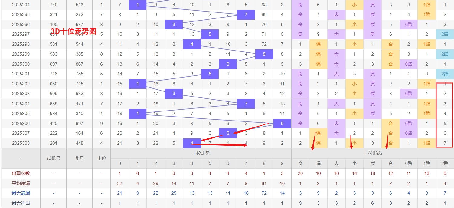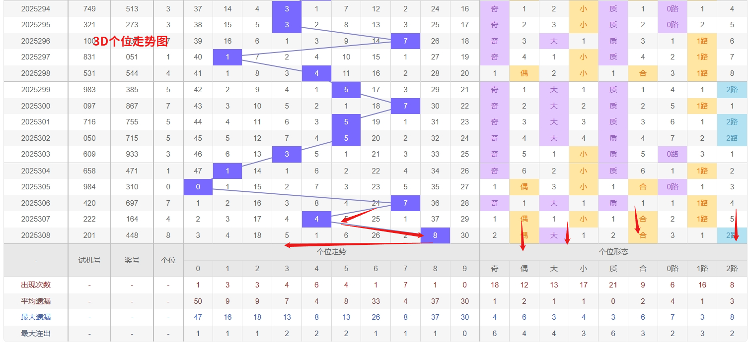 福彩3D个位分析:第2025308期个位开出号码8属于大偶数后端,从以上个位走势图中可以看出近100期的大小比约为45:55奇偶比约为53:47大小奇偶数据上有点差异有需求但不是太明显,不太好看这时就要借助连线走势和遗漏数据来帮助我们缩水号码。上期个位落号“8”大偶数2路号码球,号码开出了4振幅,连续多期的大振必被小振幅取代幅符合我们的预期,那么本期我们在个位考虑振幅走势走前依然要转变思路考虑大振幅,具体考虑(2-5)个振幅是我们主要的方向,那么在对个位落号情况进行系统的分析时我们可以明显的看到个位号码走势呈现大范围震荡,尤其是在号码的落位特点上表现的尤为突出,那么本期我们在个位分析时就要注意号码的风险,避免出现踏空。3D个位近期走势分析,号码呈现明显的冷热分化格局。7号作为当前的热号,近期表现非常活跃,其强势状态具有明显的惯性,需重点防范其再次“连下”即连续开出的可能性。与此同时,9号已长期遗漏未开,形成显著的冷态,根据概率均衡原理,冷号随着遗漏周期的延长,其回补的预期与压力也在不断累积,值得开始布局关注。采取“追热防冷”的思路:一方面紧跟7号的热出趋势,捕捉其可能延续的强势;另一方面也要对9号的冷态回补保持警惕,因此福彩3D第2025309期个位看好12789。