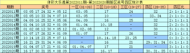 许老六大乐透第2022021期前区四区划分分析(定义:01-09段为一区,10-18段为二区,19-27段为三区,28-35段为四区):