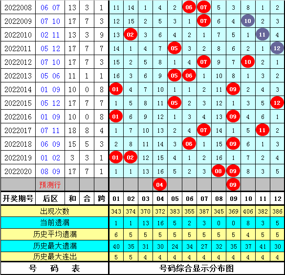 后区号码分析:后区上期开出奖号08和09,历史上前5次号码08与09同时出现之后,其下期分别开出奖号:09+11、02+10、11+12、07+09、09+12,本期后区注意号码04、08、09、10、12,精选两码04、09。