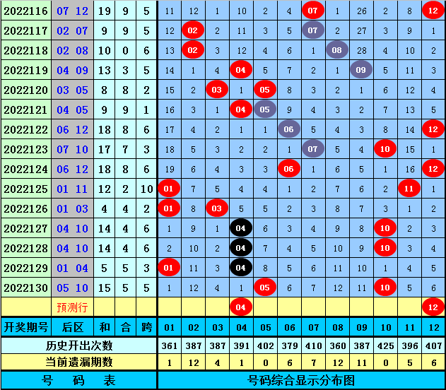 后区分析【一区01-04,二区05-08,三区09-12】:上期后区奖号为05和10,分别落在第二、三区,近50期后区三区比为33:35:32,近10期三区比为8:5:7,本期注意第一、三区号码出现,关注两码04+12。