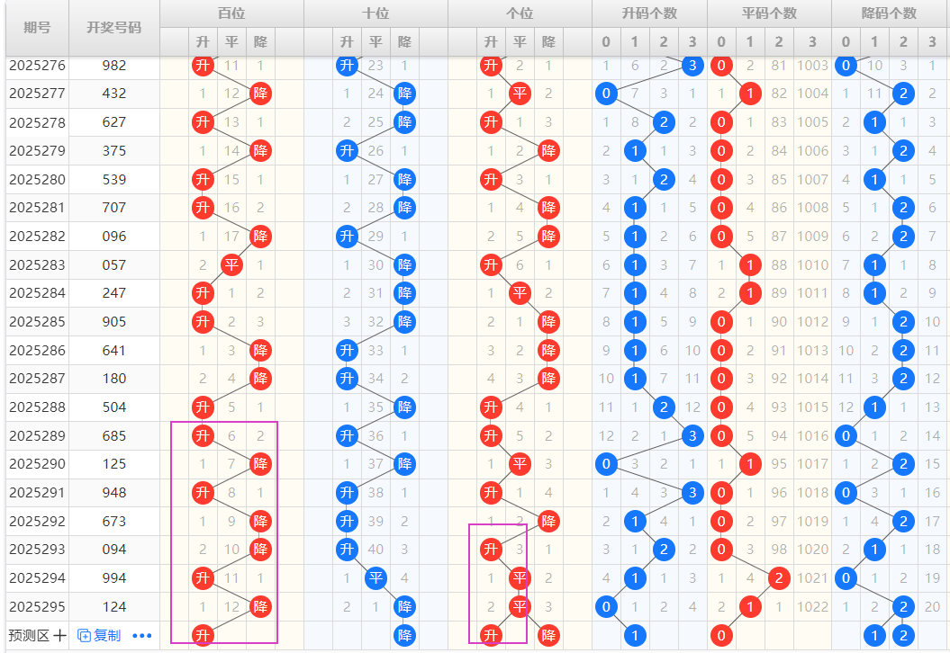 【排列3个位】:近十期升降走势为:平-降-降-降-升-升-平-升-降-升-平-平,为一种单一加重复性的交错走势,结合走势图可以看出,图中紫色框圈出为一种M形态的出球方式,本期可以重点看好升的形态号码的开出。