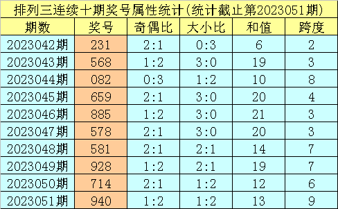 上期回顾:排列三第2023051期奖号:940。类型:组六,奇偶形态:奇偶偶,大小形态:大小小,和值:13,跨度:9。