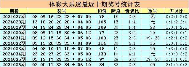 上期开奖:大乐透第2024036期奖号为:02 05 11 32 34 + 06 10,前区号码和值为84,跨度为32,奇偶比为2:3,重号:05,五区比为2:1:0:0:2。