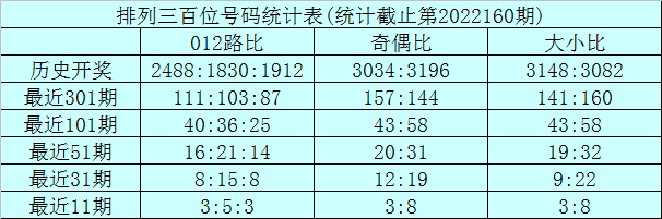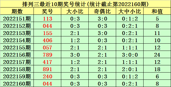上期回顾:排列三第2022160期奖号为:044。奖号类型:组三,和值:8,奇偶比:0:3,跨度:4,大小比:0:3。