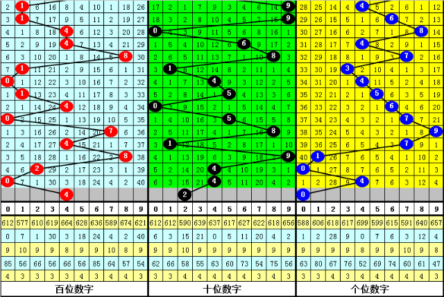 大中小分析:在组选0-9号码分布图中,前10期小号(0-2区段)出现11枚奖号,中号(3-6区段)出现12枚奖号,大号(7-9区段)出现7枚奖号,上期大号区域轮空,本期防大号转冷,预计7-9区段无号。