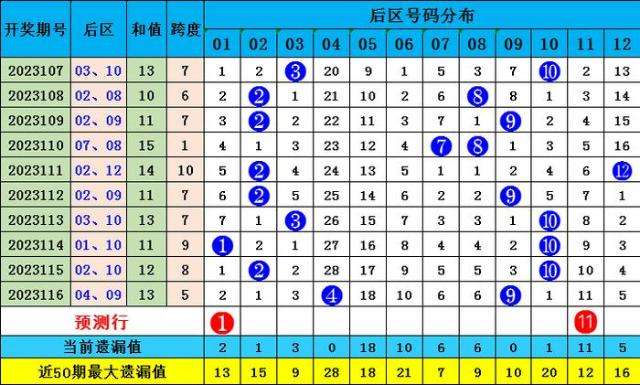 上期后区开出1、0路号码组合:04 09,最近10期后区奖号012路比为6:7:7,0路出号频次较低;本期后区奖号继续关注1路和2路,后区参考:01 11。