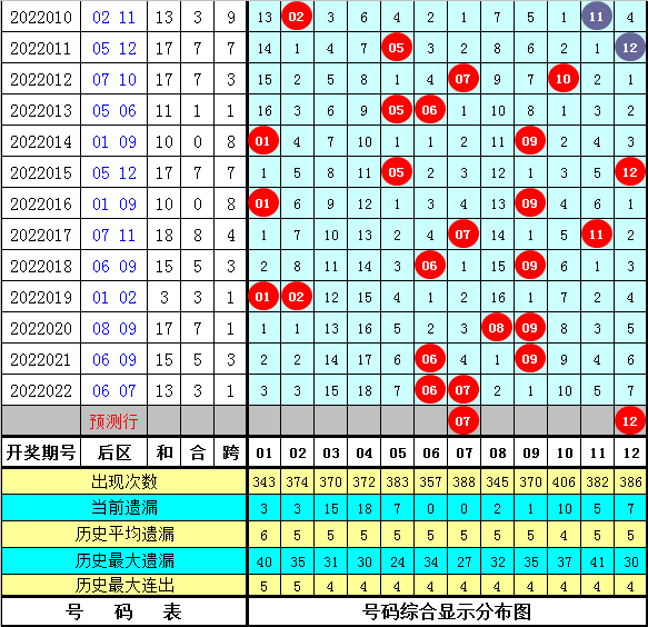 后区分析:上期后区奖号为06和07,最近十期后区开出11个热码、7个温码和2个冷码,本期预计奖号关注热码+温码组合,参考两码07、12。