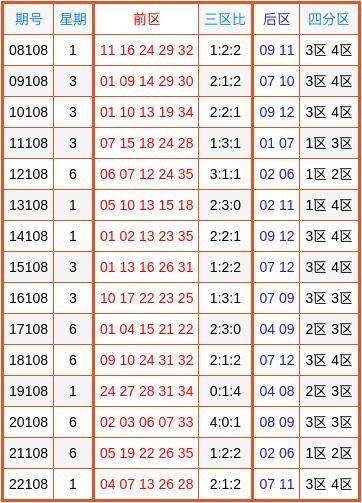 一区奖号【01-12】:在历年大乐透第108期同期奖号中,该区开出率为34。67%,表现一般,与理论概率相近。本期预计该区出号3枚,推荐出号关注:03、04、06。