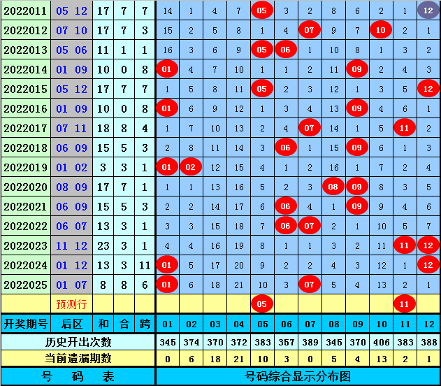 后区分析:上期后区奖号为01和07,最近5期后区和值分别为15、13、23、13、8,后区跨度分布范围在1-11,本期后区注意两码05、11。