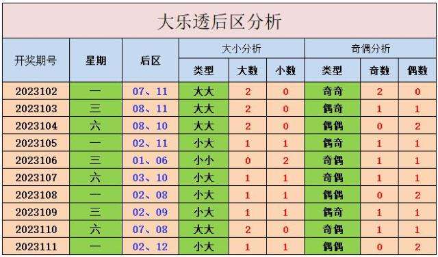 大小分析:最近10期后区大小比为13:7,大数数量多于小数数量,本期推荐小小组合。