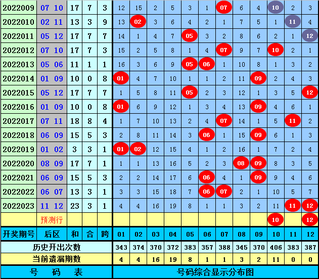 前区012路分析:上期前区012路比为1:2:2,各路号码出现个数平衡,最近30期前区012路比为35:59:56,0路号码表现较冷;最近10期前区012路比为13:25:22,本期预计2路号码相对活跃,注意0路号码表现较冷,关注012路比0:2:3。