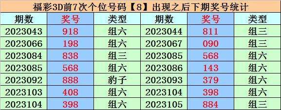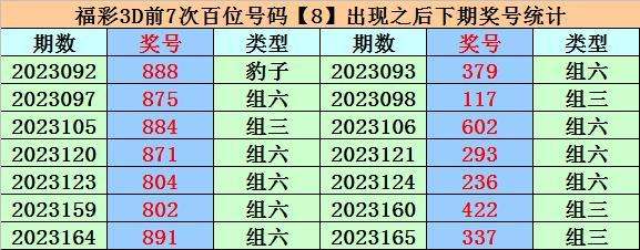 在百位号码8前7次开出之后,其下期分别开出号码:3、1、6、2、2、4、3,其中号码奇偶比为3:4,大小比为1:6,012路比为3:2:2。