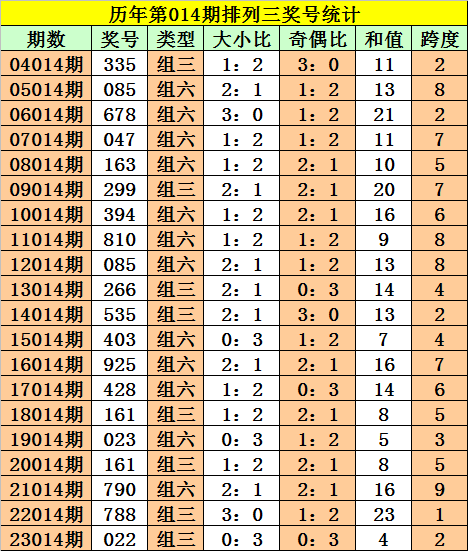 排列三第2023014期奖号:022,和值4,跨度2,大小比0:3,奇偶比0:3。
