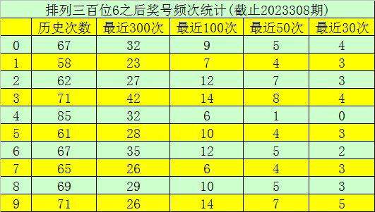 第一位杀号:上期第一位奖号为6,第一位奖号6历史上出现677次,前100次该位开出奖号6之后,下期号码0-9出现次数从高到底分别为:号码9、3→14次,2、6→12次,5、8→10次,0→9次,1→7次,4、7→6次。