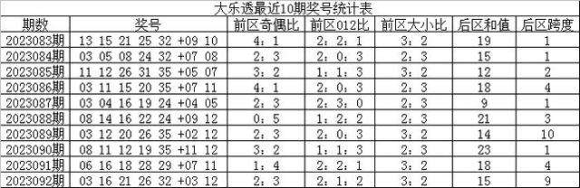 大乐透第2023092期奖号为:03 16 21 26 32+03 12。当期前区奖号012路比为2:1:2,冷热比为3:2,包含1个重号:16,没有开出连码,后区开出一奇一偶、一大一小组合。