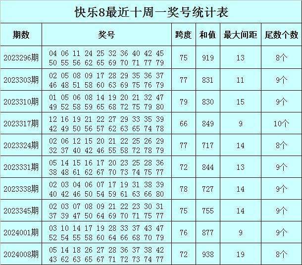 福彩快乐8第2024014期开奖回顾:02 06 15 16 17 21 31 35 37 41 44 45 46 48 51 53 55 58 62 68,其中奖号首尾间距为66,和值为751,最大间距为10,尾数分布为:尾数0、9包含0个号码,尾数3、4包含1个号码,尾数2、7包含2个号码,尾数6、8包含3个号码,尾数1、5包含4个号码。
