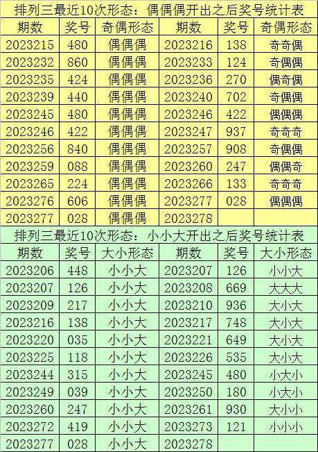 排列三最近10次同时开出奇偶形态:偶偶偶和大小形态:小小大时其奖号分别为:406-246-446-006-448-026-246-048-006-448-028,下期分别开出号码为:188-291-049-015-469-329-492-559-437-126,详细统计见下表: