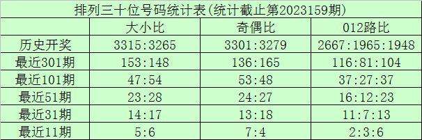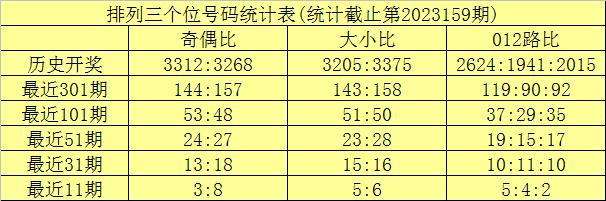 上期回顾:排列三第2023159期奖号为:319。奖号形态组六,大小比1:2,奇偶比3:0,012路2:1:0。