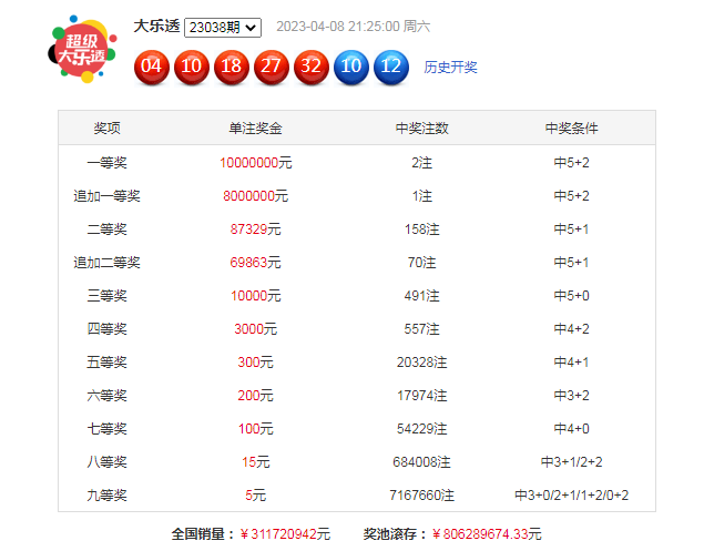 大乐透第23038期开奖。当期开奖号码为:前区04 10 18 27 32,后区10 12。当期前区号码大小比为3:2,奇偶比为1:4,三区比2:1:2,后区开出大大组合10 12