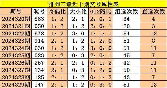 上期回顾:体彩排列三第2024329期奖号:147,奇偶比2:1,大小比1:2,012比0:3:0。
