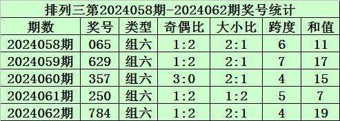 上期回顾:排列三第2024062期开奖号码为784。奖号类型为组六,奇偶比为1:2,大小比为2:1,跨度为4,和值为19。