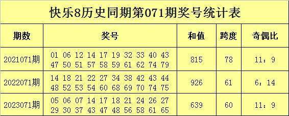 奇偶比分析:去年第071期奖号奇偶比为11:9,历史同期第071期奖号奇偶总比例为28:32,偶数号码表现较热,今年第071期看好奇数号码表现较热,参考奇偶比12:8。