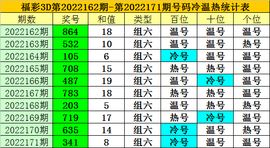 上期回顾:福彩3D第2022171期开奖奖号为:341,奖号类型为:组六,奖号冷温热态为:冷号+温号+温号。