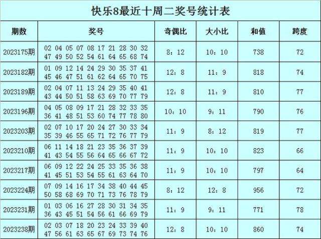 福彩快乐8第2023238期(上周二)开奖回顾:02 03 07 18 20 23 24 33 39 40 47 56 61 63 65 67 69 73 74 76,其中奖号和值为860,跨度为74,奇偶比为12:8,大小比为10:10。