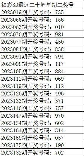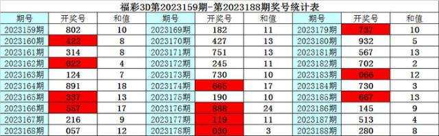 上期回顾:福彩3D第2023188期奖号为:280,其中奖号组选类型为:组六,奇偶比为0:3,大小比为1:2,012路比为1:0:2,和值为10,跨度为8。