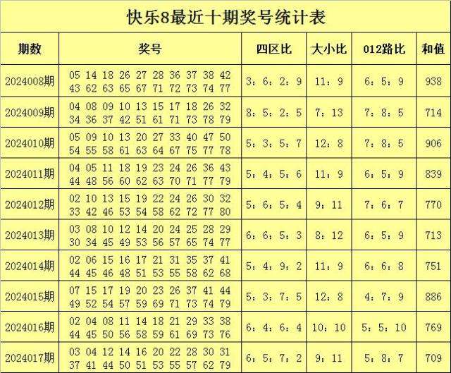 福彩快乐8第2024017期开奖回顾:03 04 12 14 16 20 22 28 30 31 37 41 44 50 51 53 55 57 62 79,其中奖号四区比为6:5:7:2。