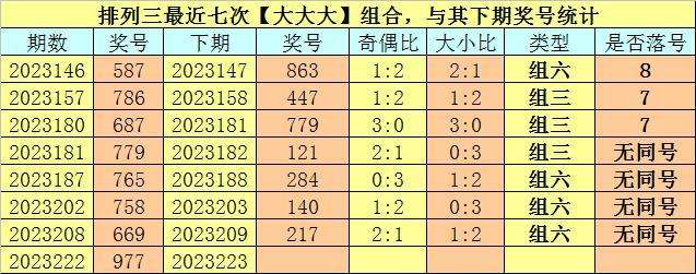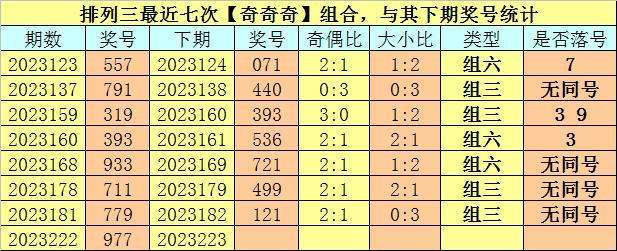 奖号类型分析:排列三最近七次【大大大】组合与【奇奇奇】组合出现之后,其下期组三号码开出7次,组六号码开出7次,其中组六号码出现次数相对较少,本期适当关注组六号码出现。另外,其下期有8期没有出现重号,本期不看好开出重号。