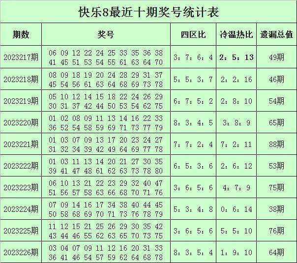 福彩快乐8第2023226期开奖回顾:03 04 07 09 11 12 16 20 31 33 36 41 46 54 57 59 62 64 68 78,其中奖号四区比为8:3:5:4,冷温热码比为1:9:10,遗漏总值为64。