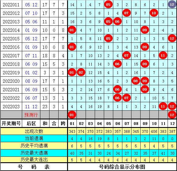 后区分析:后区上期开出奖号11+12,为2路号+0路号,最近10期后区号码012路比为10:5:5,其中号码01出现5个,号码04、10、11出现1个,号码02、03、05、06、07、08、09、12没有出现。本期看好后区在01、03、09、10、11、12之中落号。