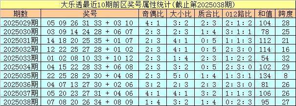 开奖回顾:体彩大乐透第25038期开出奖号为:07 08 20 26 34+08 09,前区奇偶比为1:4,大小比为3:2,012路比为0:2:3,质合比为1:4,后区奇偶比为1:1,大小比为2:0,012路比为1:0:1,质合比为0:2。