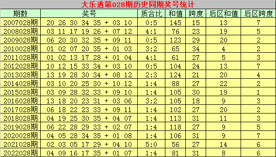 后区分析:在第028期历史同期开奖中,后区和值分别开出13、19、20、4、5、13、20、22、19、9、20、11、9、9、14、8,本期看好后区开出大和值,关注和值14。