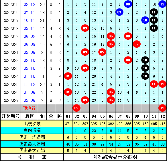 开奖回顾:体彩大乐透第23027期奖号为:09 10 12 15 23 + 03 06,前区奖号质合比为1:4,和值为69,跨度为14。后区奇偶比为1:1,大小比为0:2。