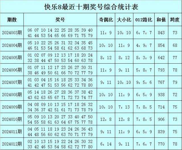 福彩快乐8第2024012期开出奖号:02 10 13 15 19 22 24 26 30 32 33 42 46 53 54 58 62 72 77 80,其中奖号奇偶比开出6:14,大小比开出9:11,和值开出770,跨度开出78,012路比开出7:6:7。