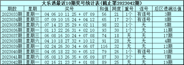 前区和值分析:最近3期前区和值分别开出:79、87、89,最近10期和值波动范围为56-116区间,上期和值上升2个点位,本期注意和值转向下降,预计在79-89区段开出。
