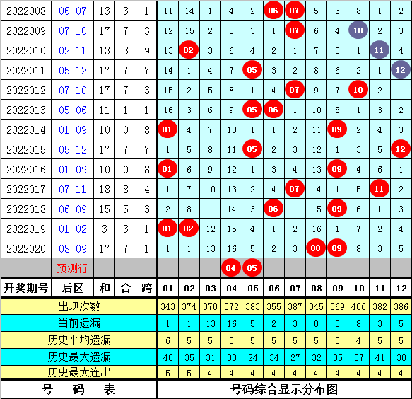 9。在历史同期奖号中,后区号码09出现6次;08出现4次;01 04 11出现3次;02 03 06 07出现2次;05 10 12出现1次。