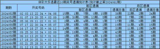体彩大乐透第2024061期开奖回顾:前区奖号:01、12、19、31、33,后区奖号05、08,前区前各位遗漏:7期、12期、7期、1期、3期,遗漏总值30期,后区各位遗漏5期和8,遗漏总值13期。