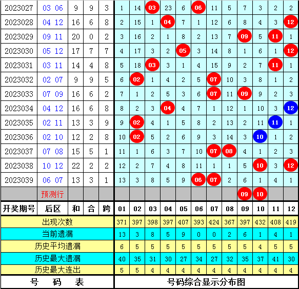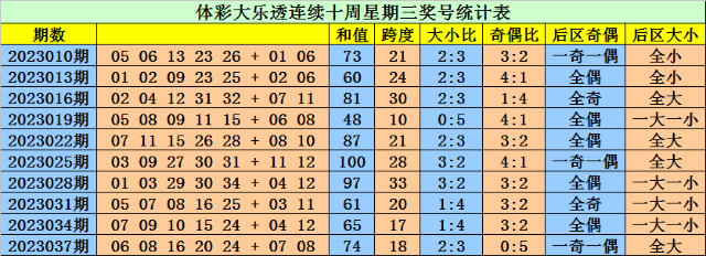 后区分析:最近10周星期三后区号码奇偶比为7:13,偶数开出频次较高,号码大小比为12:8,大号相对活跃,本期后区精选两码09和10。