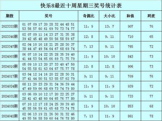 福彩快乐8第2024042期(上周三)开奖回顾:02 06 13 19 21 26 30 31 32 46 49 55 56 58 59 60 64 76 78 80,其中奖号和值为861,跨度为78,奇偶比为7:13,大小比为11:9。
