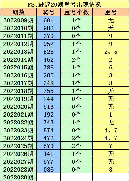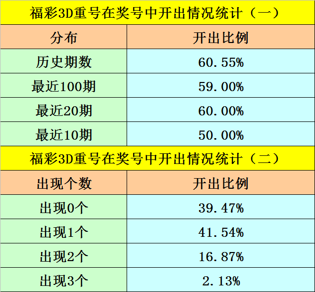 最近100期开奖中,含有重号的奖号有59期,最近20期含有重号的奖号有12期,最近10期含有重号的奖号有5期。本期注意重号落号。