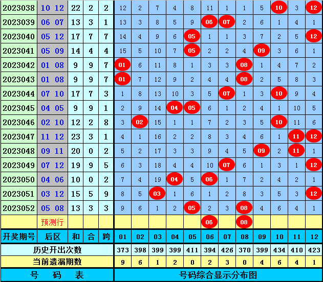后区分析:上期后区开出全2路号、一质一合组合,最近10期后区奖号012路比为6:7:7,质合比为9:11,本期看好后区在04、06、07、08、09之内落号,精选后区奖号06、08。